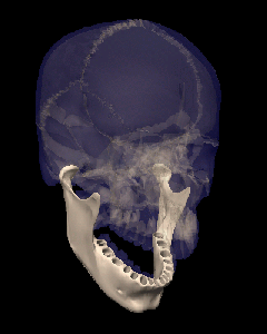 150.000 triangles XGL rendered image (reduced to 8bit gif) This is a medial view of a human skull model. The mandibula bone is exposed. Model provided as No. VP2503 by Viewpoint DataLabs Inc. Orem Utah, US.