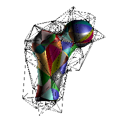 | To reconstruct a model from such digitized scattered data you have to connect the sample points to get a surface approximation. So called Alpha-Shapes are often used for piecewise-linear approximation of dense scattered data. They are a generalization of the Convex-Hull and part of the Delaunay-Triangulation . They consist of points, lines, triangles and tetrahedra. To get a continuous differentiable (i.e. smooth) approximation of the object's surface the alpha shapes are split in several surface parts which are then replaced by polynomial patches. |